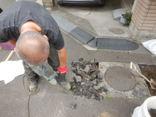 アスファルトを斫り、コンクリート桝を撤去します。桝の上流側の排水管はそのまま残し、新しい塩ビパイプを接続します。