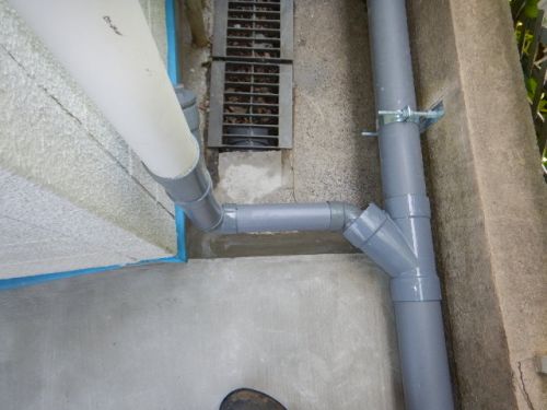 排水管・雨水管も塩ビのVU管で露出配管しています。ちなみに横浜市港北区大曽根台のM様宅は合流式下水道区域になります。