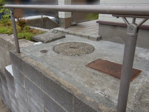 S様の方で止水セメントで補修し応急処置をしていましたが、抜本策として排水桝をすべて交換したいと、施工依頼をくださいました。