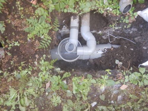 土を掘削してみると、桝の破損で排水が土中に流れ出し、土が陥没していました。このまま放置していたら、桝が沈んで引っ張られた排水管が割れたりする可能性もありました。