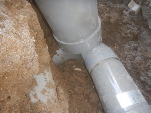 排水の流れが悪いとのことで調べたところ、既設コンクリート桝が何らかの原因で動いたと思われ、桝からパイプが脱落しかけており、桝の段差で流れが悪くなっていました。