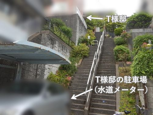 T様のお宅は高台にあり、水道メーターがある駐車場から建物までは階段を40段ほど上がります。