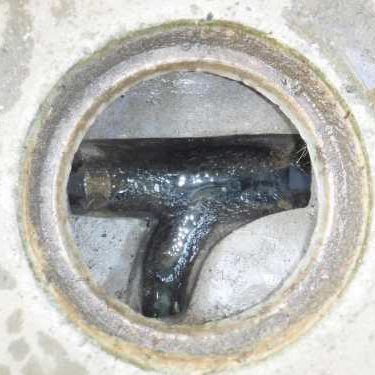 防臭キャップを外して排水管内部を見たところ、油汚れが冷えて固まり排水管内部を塞いでいました。